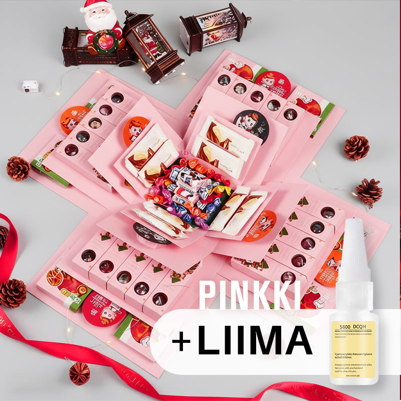 Meidän räjähdyslaatikollamme muutat yksinkertaiset lahjat sydämellisiksi yllätyksiksi. Personoi jokainen kerros kuvilla ja viesteillä luodaksesi unohtumattoman kokemuksen, joka on täynnä rakkautta ja iloa.